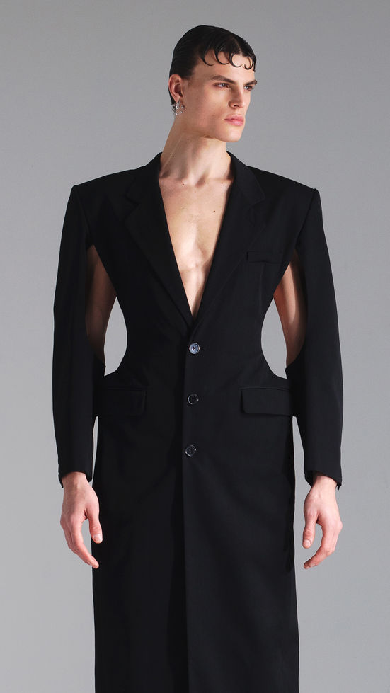 - Black wool floor length coat with cutout at waist and sleeves